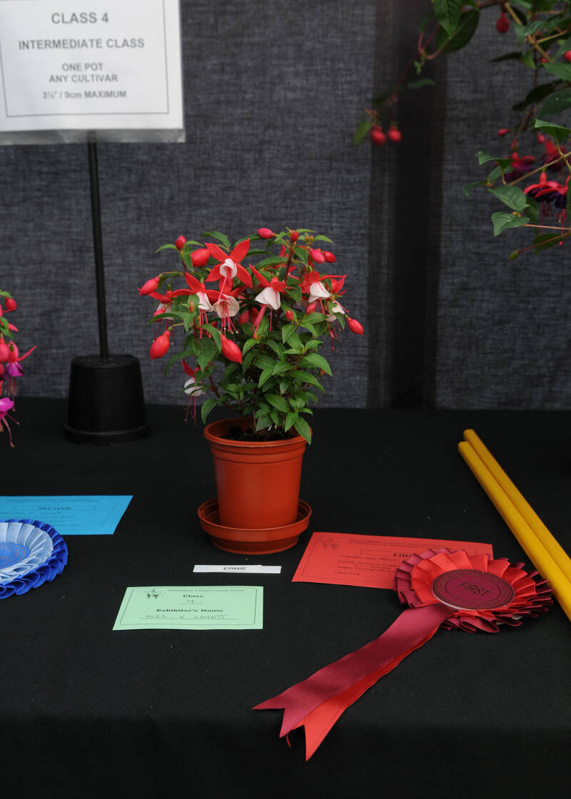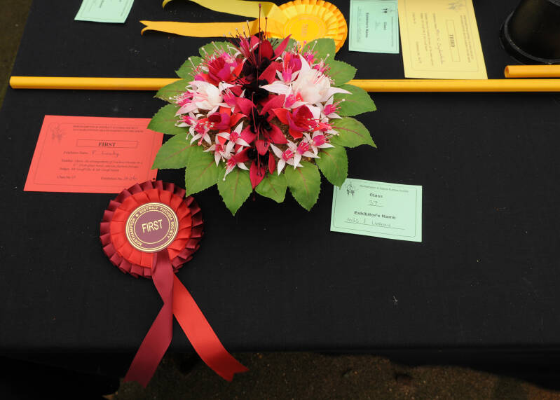 Pat Leahy scored two firsts with her arrangement of fuchsia flowers in a glass bowl and her entry of Tango in the Novelty class.