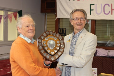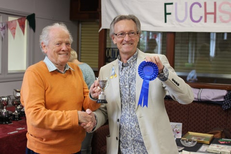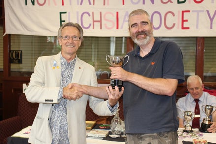 The John Belton Memorial Trophy being presented to Phil Thorn for his winning entry in the Society Plant classes and his entry of Lillian Annetts.