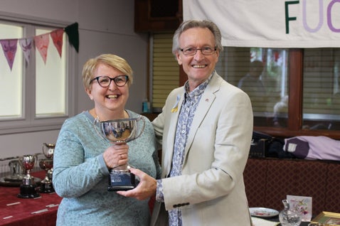 Wendy Addington being presented with the J W Jupp & Son Trophy for her best exhibit in the Cut Blooms classes.